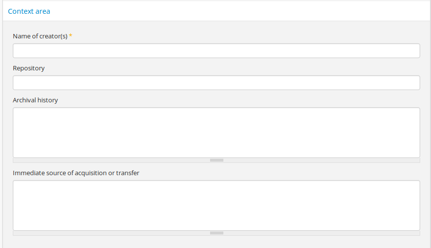 The data entry fields for the Context area using the ISAD(G) template, including Name of creator(s), Repository, Archival history and Immediate source of acquisition or transfer.