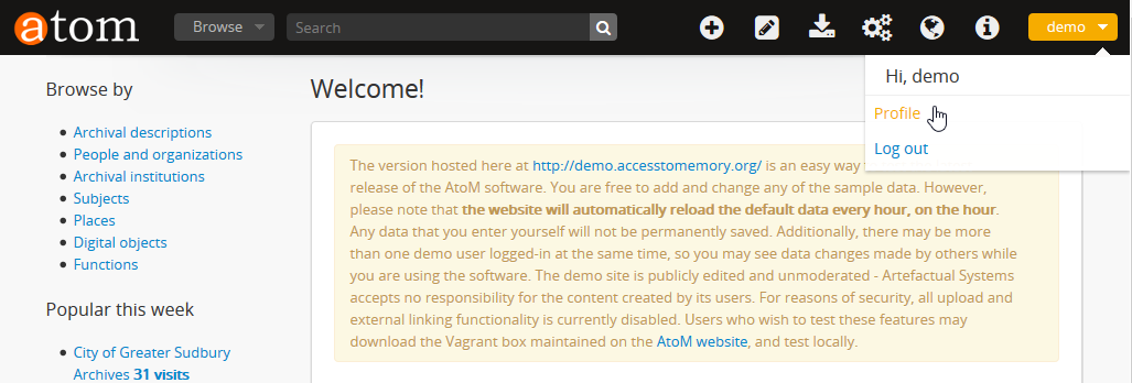 AtoM re-loads the home page, now customized to your user role. The main menu is now visible. Your username will appear where the log in button was, giving you access to your user profile.
