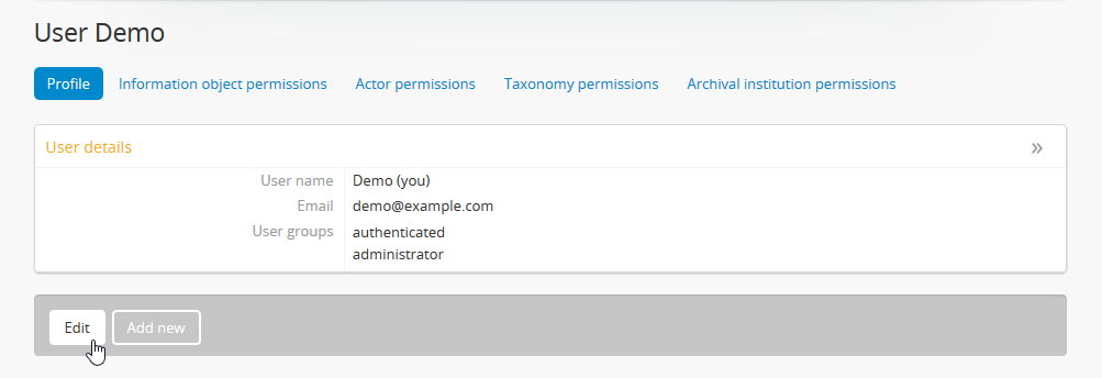 - If the two passwords entered in “Change password” and “Confirm password” do not match, AtoM will indicate so below the “Confirm password” field. If you try to save the page with with mismatched password entries, AtoM will clear both fields, and reload the page with an error message. You can now re-enter your password - make sure it’s the same in both fields!