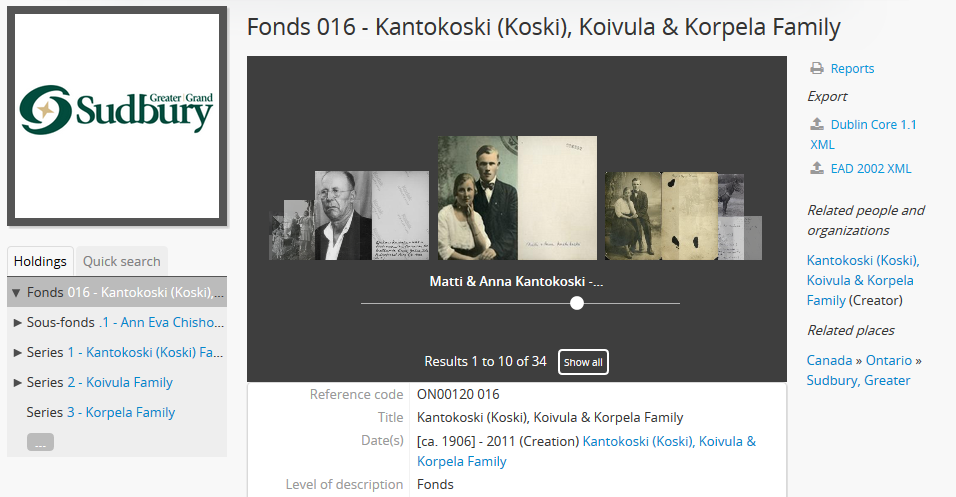 At higher levels of description, the view page of a parent record will include thumbnails of all digital objects registered at lower levels. The thumbnails are displayed using a carousel viewer so you can easily scroll through the set using your mouse or keyboard’s arrow keys. Clicking on a thumbnail will redirect you to the view page for the description associated with that digital object. If more than 10 digital objects appear at lower levels, AtoM will display the first 10 in the carousel and provide a link to a digital object browse page to explore the rest if desired. For more information, see the Carousel entry in Navigation in AtoM.
