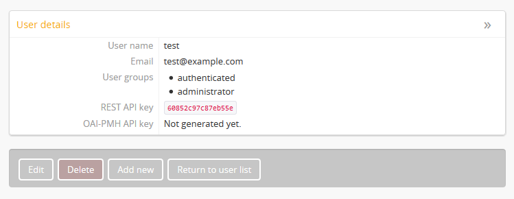 1. AtoM will reload the User profile page in view mode - you will now see an API key value listed on the user’s profile.