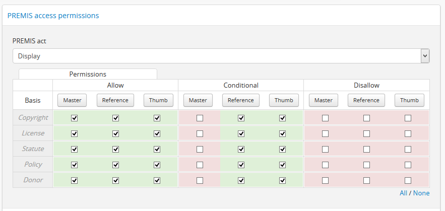 AtoM also allows you to choose one PREMIS rights act (such as Display, Disseminate, etc) to use as an action for your digital objects - though you can configure different digital object access permissions for each PREMIS rights Basis. See Make rights actionable on digital objects, below.