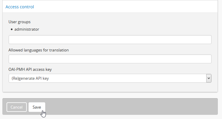 Manage user accounts and user groups, specifically: Edit an existing user. - AtoM will redirect you to the edit page for the user. At the bottom of the profile edit page, in the Access control area you will see a drop-down menu labelled “OAI-PMH API access key.”