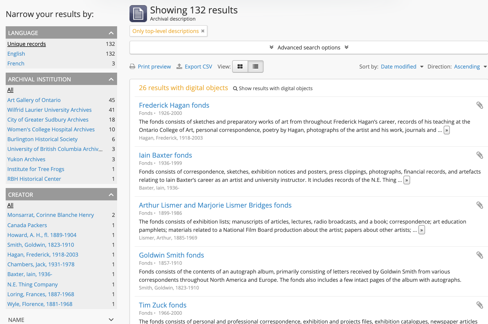 For more information on using the elements of the archival description browse page, see: Browse archival descriptions.