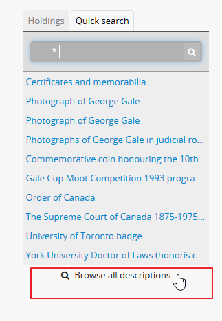 - Using the Browse menu located in the The AtoM Header Bar, navigate to Browse > Archival descriptions.