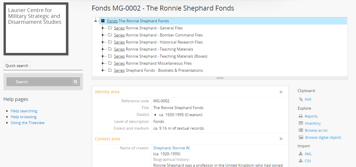 - If you have configured a custom sidebar menu with links to static pages, these will appear on all archival description view pages below the Quick search and Treeview, in addition to the home page. For more information, see: Add a custom sidebar menu with links to your static pages.