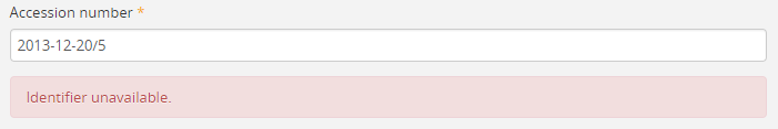 1. If you attempt to use a value for the Accession number that is not unique (i.e. is already in use by another accession record), AtoM will provide a warning, and will not allow the record to be saved until the Accession number is edited and a unique value is added.