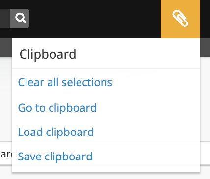 The menu has four options. The “Clear selections” option will remove all items (across all entity types) currently pinned to the clipboard. On the clipboard page, they won’t be cleared until you refresh the browser, giving you an opportunity to re-pin them if you’ve removed them by accident - however, anywhere else in the application, this removal will be immediate. The “Go to clipboard” option in the menu will take you to the Clipboard page, described in more detail below: Using the clipboard page. The “Save clipboard” option will allow you to save your selections and return to them at a future session, and the “Load clipboard” option will load a previously saved selection. For more information on these options, see below: