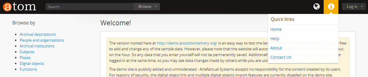 Another example of this is the light yellow box that appears on AtoM’s “Welcome” static page warning users that the data will reset every hour.