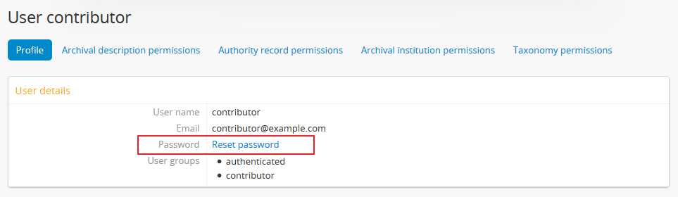 - If the two passwords entered in “Change password” and “Confirm password” do not match, AtoM will indicate so below the “Confirm password” field. If you try to save the page with with mismatched password entries, AtoM will clear both fields, and reload the page with an error message. You can now re-enter your password - make sure it’s the same in both fields!