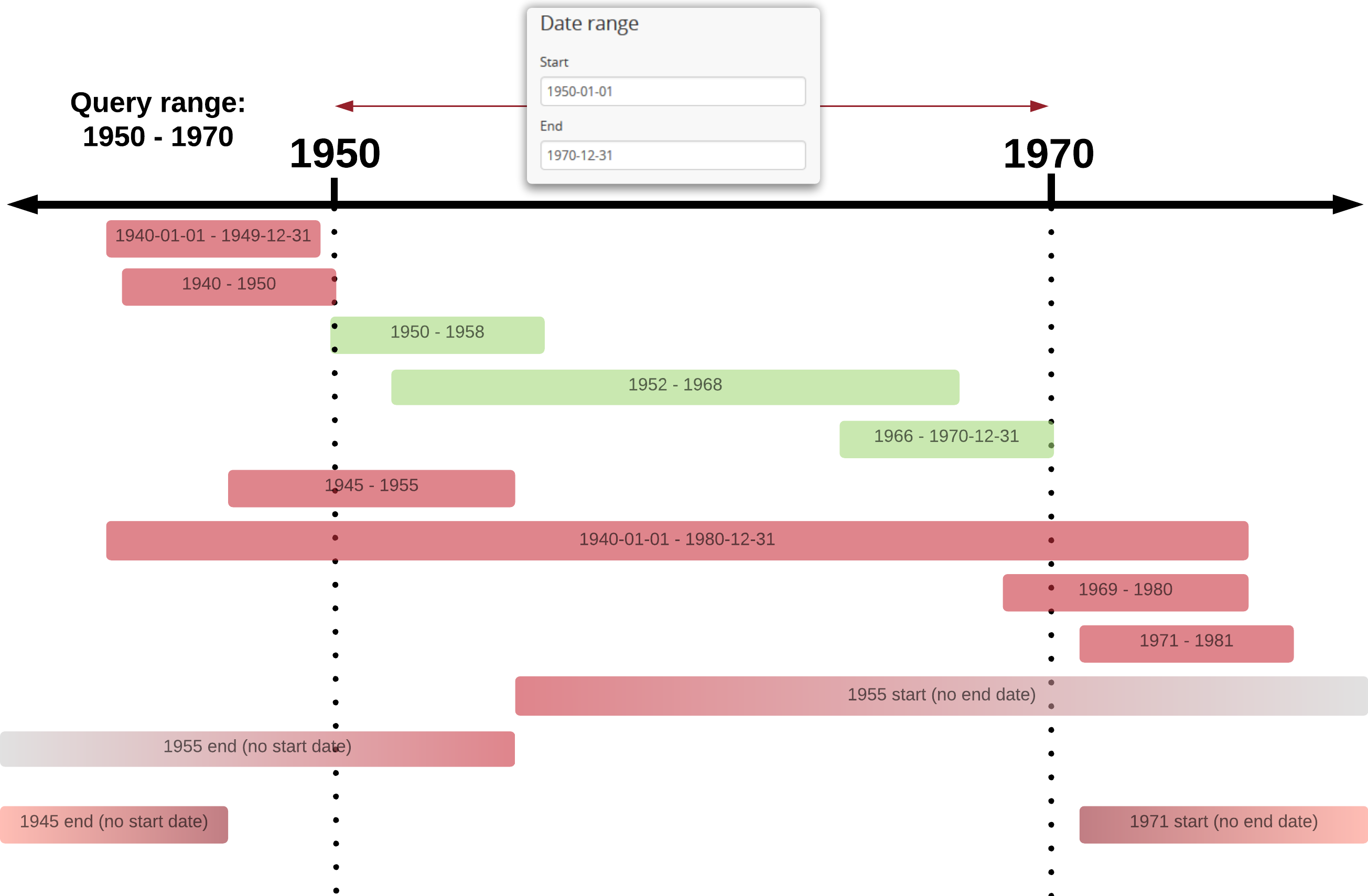 To better clarify these options, some example diagrams have been included below to indicate the difference, illustrating how each option behaves for closed ranges (both start and end date included), and open ranges (where either a start or end date is included, and the second date is left blank). In the following images, results in green will be returned by the search query; results in red will be excluded from the results: