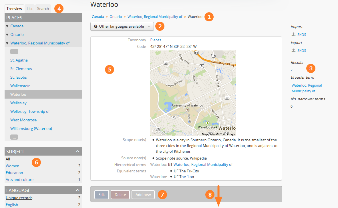In the above example, the user has added the term “Waterloo” to the description - but the term is organized hierarchically in the Places taxonomy, and its parent terms are inherited. Because of this, when browsing results for the parent term “Waterloo, Regional Municipality of”, the example description will appear, even though the term was not directly added.