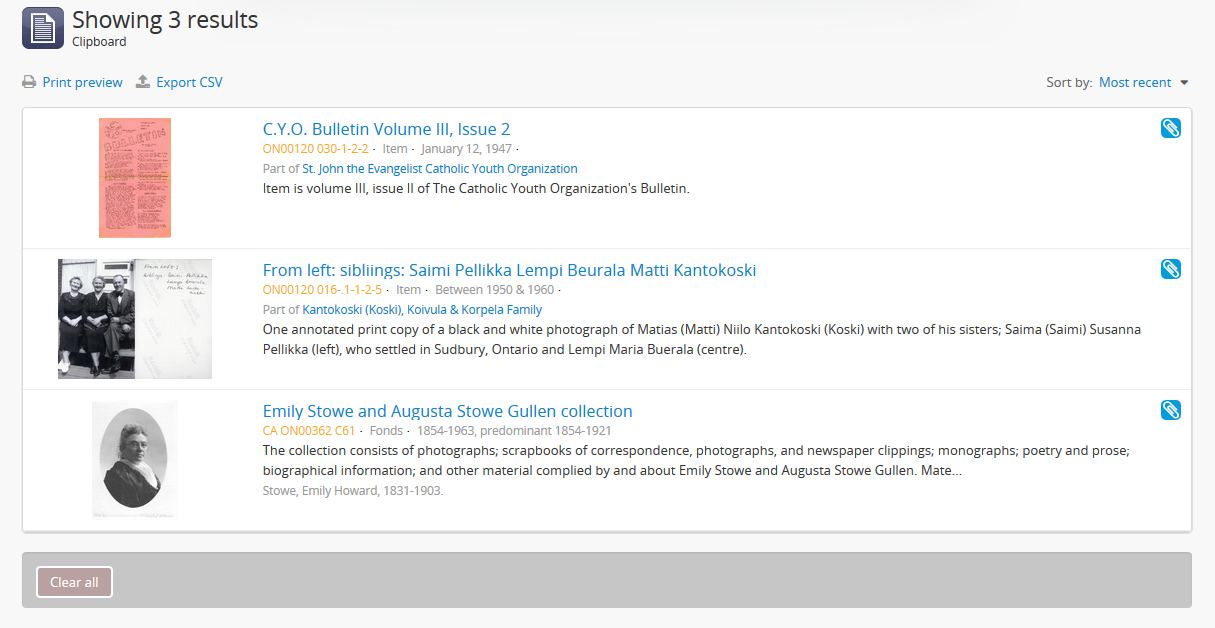 The Clipboard is a user interface element that allows users to select archival descriptions while searching and browsing, and add them to a list (the “clipboard”), for later review or further action. Authenicated users (i.e. those logged in) can also perform CSV exports of Clipboard results via the user interface. Currently the Clipboard is only available for use with archival descriptions. Additionally, the clipboard is session-based - meaning that it does not persist between user sessions. When you close your browser, any results on the clipboard will be lost.
