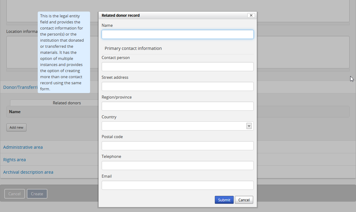 In the Edit accession record screen, under the Donor/Transferring body area you can enter the names and contact information for related donors using the donor dialog.