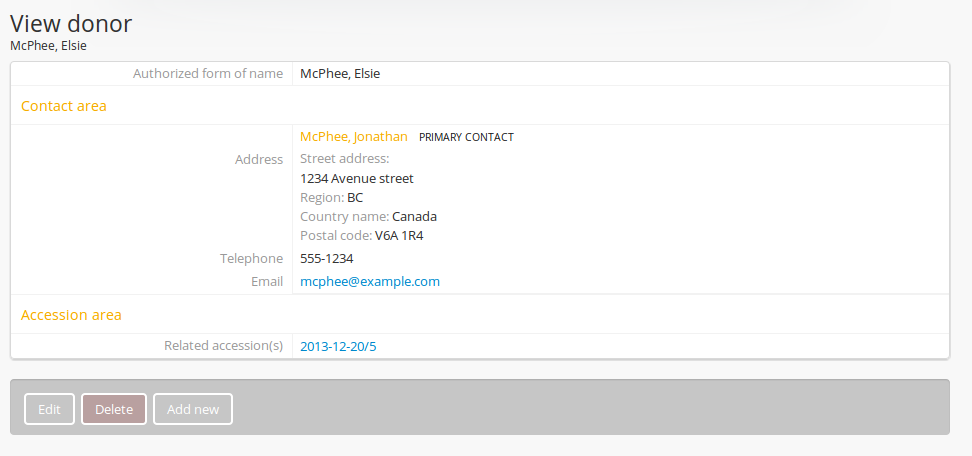 1. After saving the Donor record, AtoM takes you to the Donor record view page where you can review your changes.