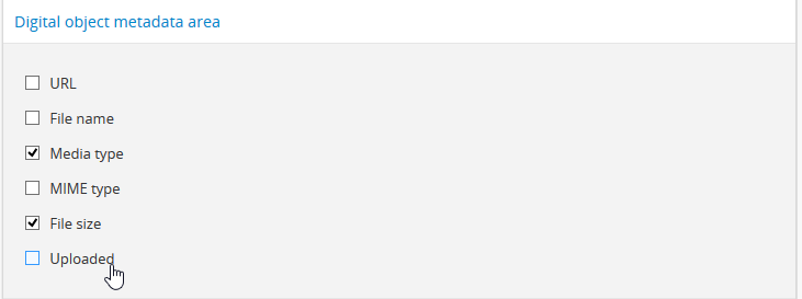 In the Digital object metadata area, check check a field to make it visible to public users, or uncheck uncheck it to hide the field from public users.