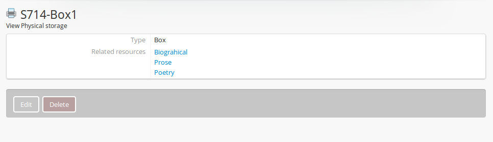 As above, click on the hyperlink container name and AtoM takes you to the View Physical storage screen.