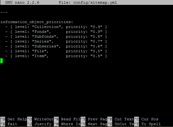 This file contains the priorities (or weighting) for each level of description of archival descriptions included in the sitemap the CLI task will generate. If you have added new levels of description to the Levels of description taxonomy, you can give them a priority here, or adjust the default priorities included in the file (shown in the image below).