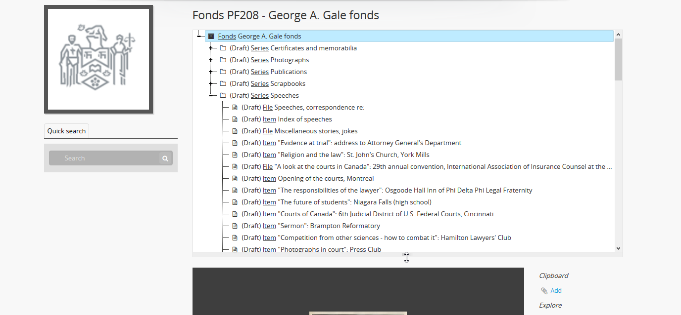 Users can also click on the “Quick search” tab to search for desriptions within the current archival unit. For more information on using the Treeview quick search, see: Treeview quick search.