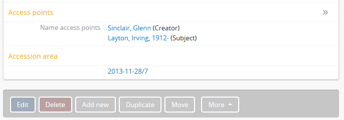 - A link to the original accession record is maintained in the Accession information area in the archival description. Similarly, a link to the archival description is added to the related accession record. These are hyperlinks; clicking them in either record will take the user to the related record.