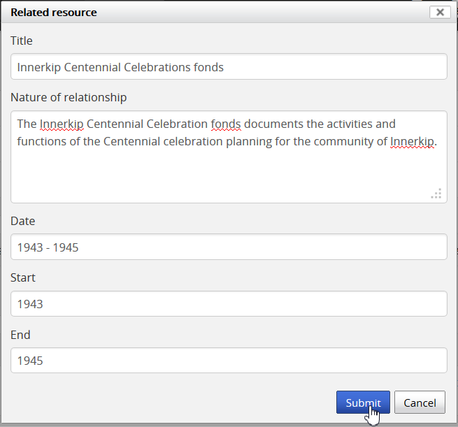5. To save your edits, click the “Save” button located in the button block at the bottom of the record. AtoM will reload the page in view mode so you can review your changes.