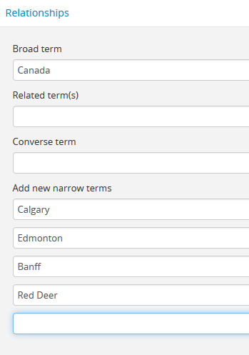 3. See the sections above for instructions on working with the fields in the Relationships area, for broader terms, related terms, and narrower terms.