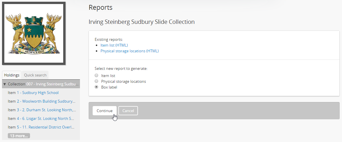 1. AtoM will reload the page to display report generation options. Options avalailable will depend on a) whether you are authenticated (i.e. logged in), and b) the lower-level descriptions available in this archival unit. For more information on file and item list reports, see: File and item list reports and printing.