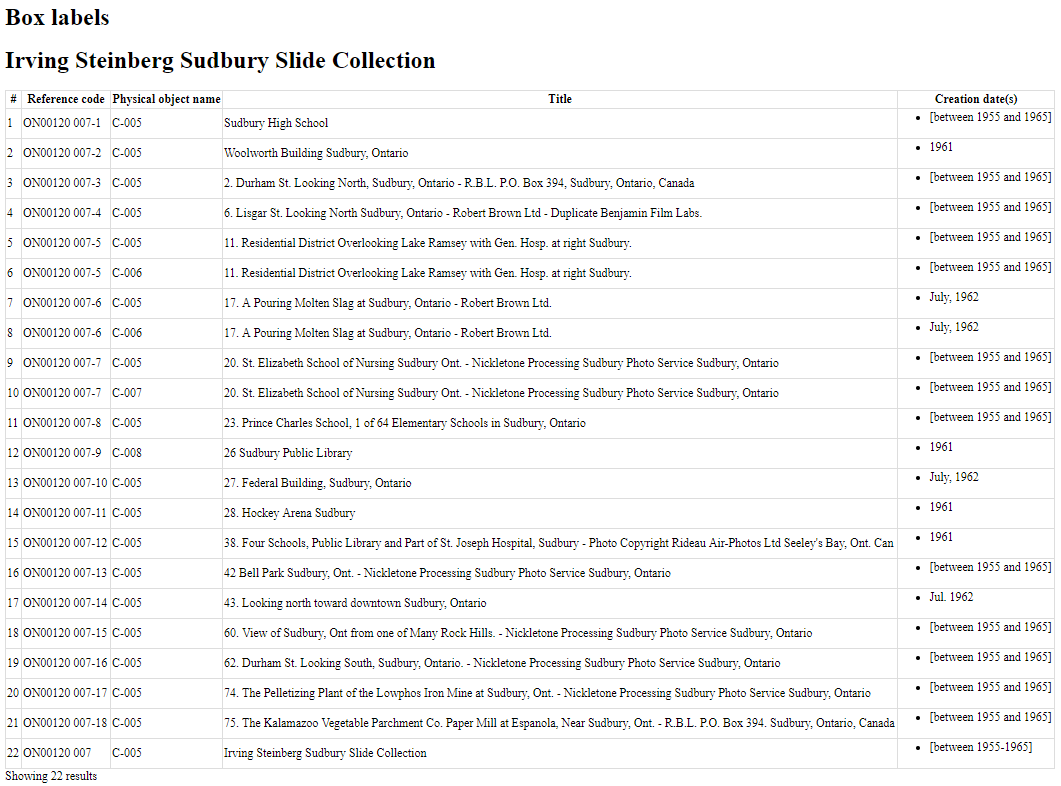 AtoM also provides a simple report that lists all archival description records associated with a particular storage location. This report is optimized for printing, and can be accessed via the Physical storage module.
