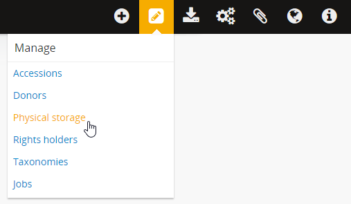 1. Navigate to the highest level of description for which you wish to create a physical storage report (e.g, for the physical storage locations of an entire fonds, view the fonds level description, etc). You can do so by searching or browsing to find the description you want - for more information on navigation in AtoM, see: Access content.