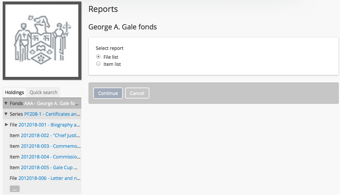 1. Navigate to the parent record description for which you wish to generate a report. For example, if you wish to see all the items in a particular series, then navigate to the view page of that series - but if you wish to see an item-level report for all items in the top-level fonds, then navigate to the view page of the fonds.