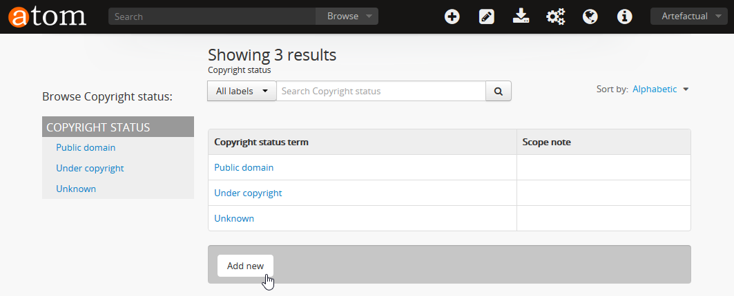AtoM ships with a fixed number of taxonomies containing default values (terms). Some terms are locked, i.e. cannot be edited or deleted, because they are used by the application’s underlying code. Most terms, however, can be edited or deleted, and all taxonomies can be assigned new terms in addition to any locked values.