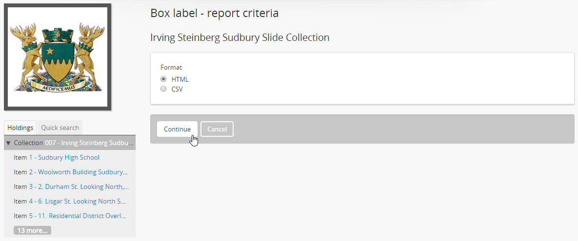1. AtoM will reload the page to display report generation options. Options avalailable will depend on a) whether you are authenticated (i.e. logged in), and b) the lower-level descriptions available in this archival unit. For more information on file and item list reports, see: File and item list reports and printing.