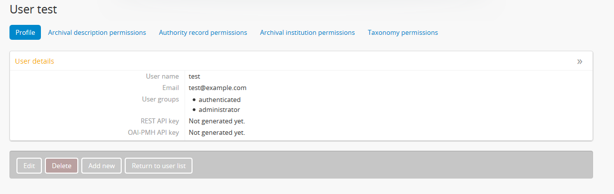 1. AtoM will reload the User profile page in view mode - you will now see an API key value listed on the user’s profile.