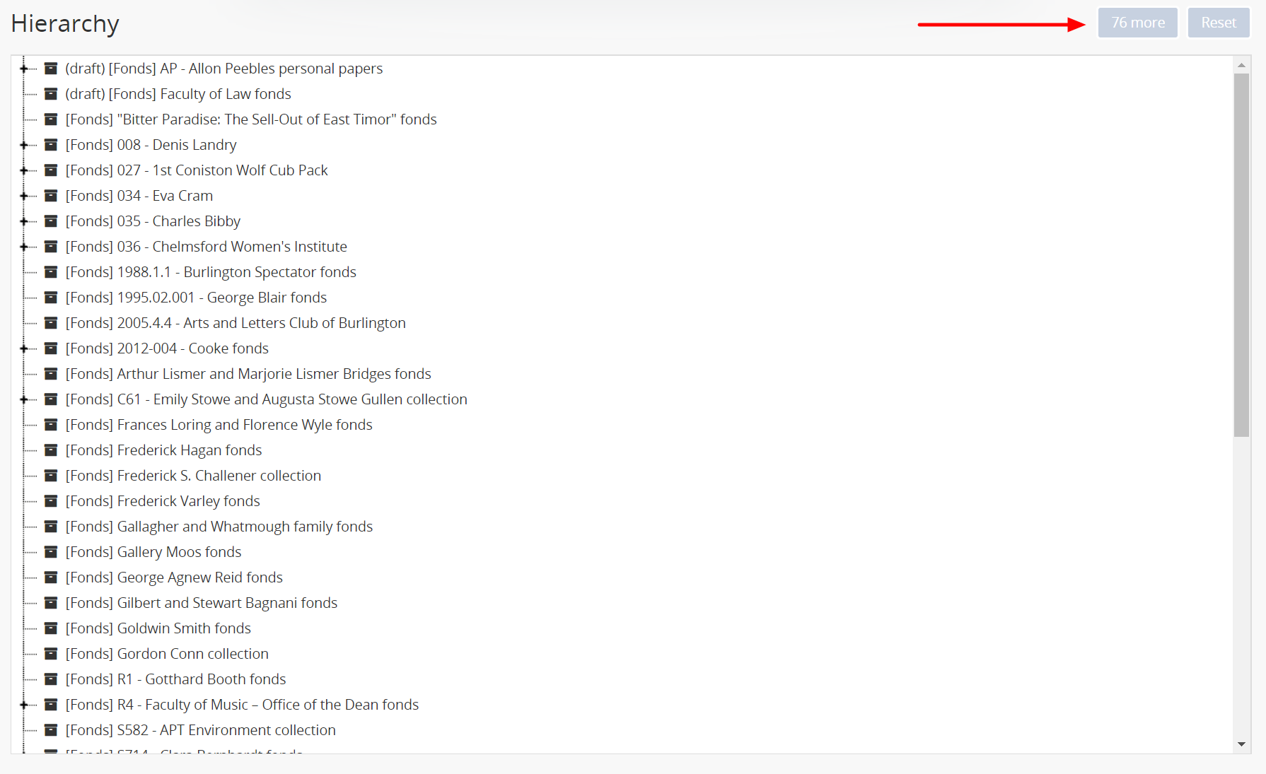4. Click on the name of the archival unit (e.g. fonds or collection) whose lower-level records (children) you would like to explore.