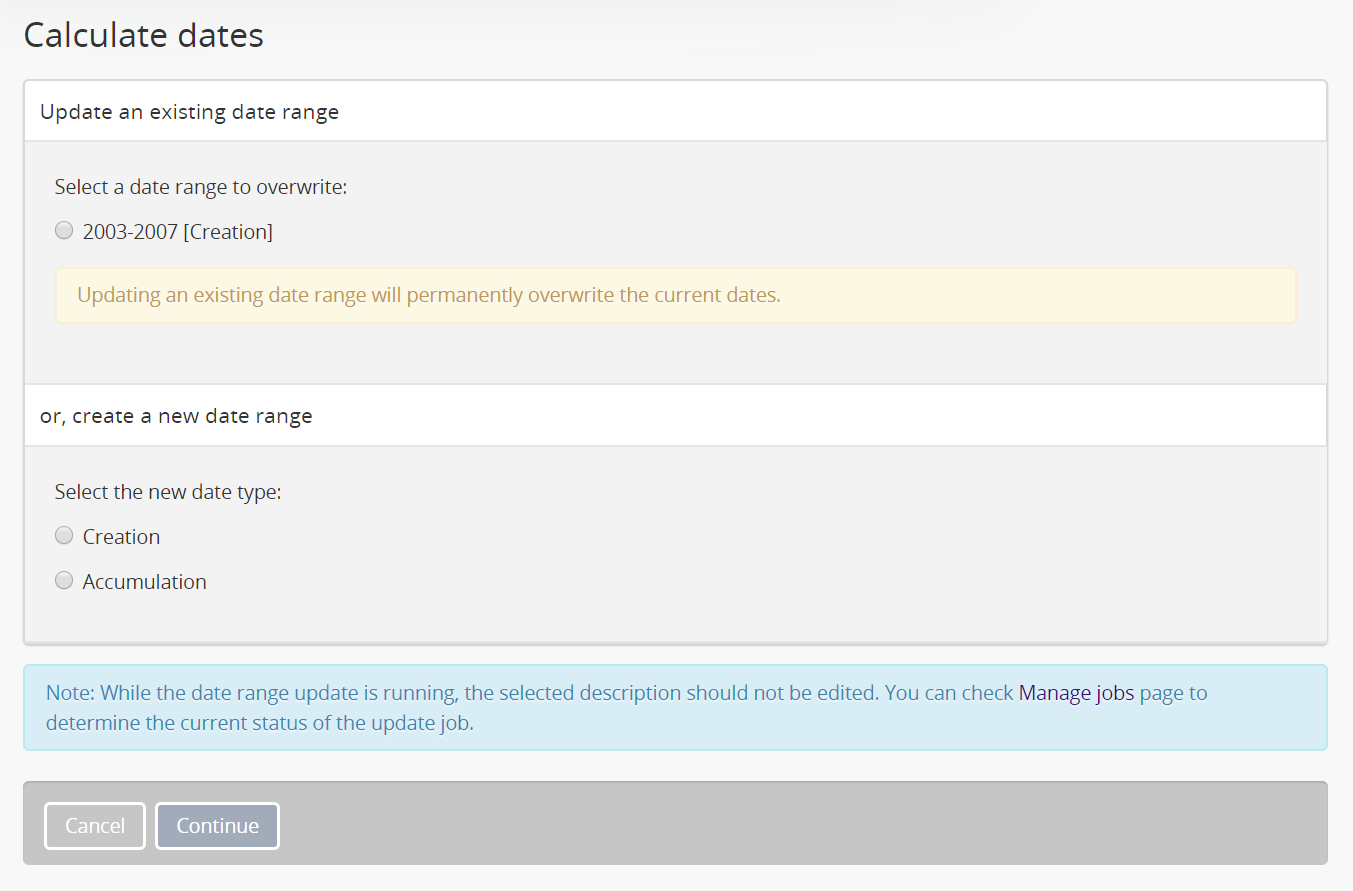 Clicking this while the identifier field is populated will overwrite any existing data - if you do this by accident, you can always click “Cancel” in the button block at the bottom of the archival description edit page.