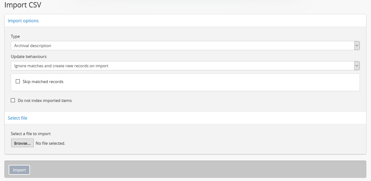 In addition to importing new records, AtoM can also attempt to identify matches on existing records and either update them in place, or delete the matches before importing the new records as replacements. This functionality will be described in greater detail below, along with other import options.