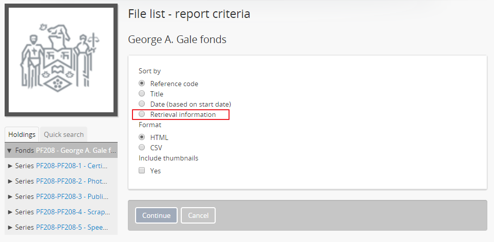 An administrator can also determine whether or not reports should include Retrieval information - that is, any physical storage information associated with the file or item, such as container name, type, and location. For more information on configuring this setting, see: Generate archival description reports as public user.
