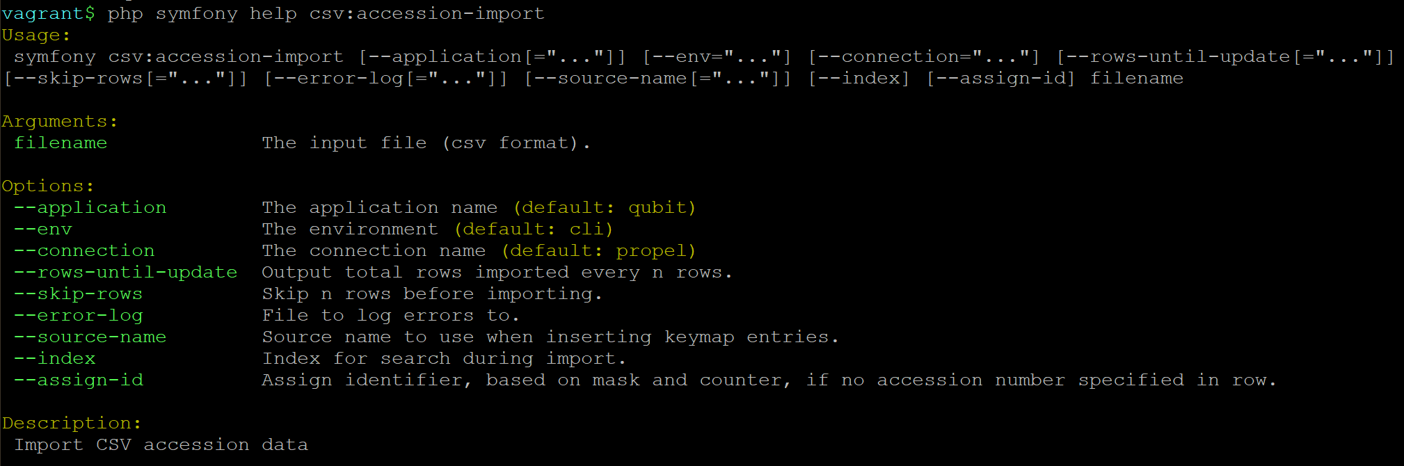 By typing php symfony help csv:export into the command-line from your root directory, without specifying an export location of the CSV, you will able able to see the CSV import options available (pictured above). A brief explanation of each is included below.