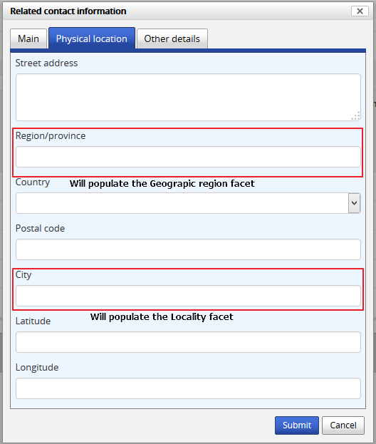 • Geographic region: Limits results to those matching data entered into the “Region/province” field in the physical location tab of the contact dialogue (available in the “Contact” area of the ISDIAH archival institution edit template)
