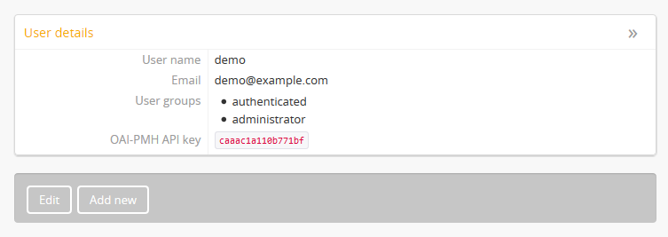 Manage user accounts and user groups, specifically: Edit an existing user. - AtoM will redirect you to the edit page for the user. At the bottom of the profile edit page, in the Access control area you will see a drop-down menu labelled “OAI-PMH API access key.”