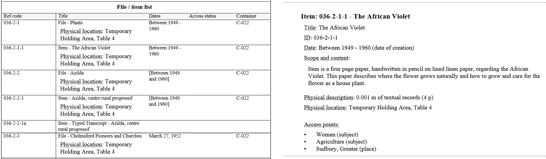 The “Inventory summary” option is best used when your lower-level descriptions do not include a lot of detail - it includes lower-level descriptions (such as files and items) in a summary table beneath each parent record, such as a series, sub-series, subfonds, etc. When lower-level descriptions include more detail, such as a scope and content description, you may want to include this information in the finding aid - choose “Full details,” and each level of description will display all fields available. A comparison image is included below, with the Inventory summary on the left, and a sample item description with full details on the right: