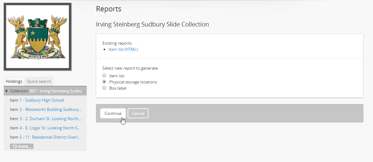 AtoM will reload the page to display report generation options. Options available will depend on a) whether you are authenticated (i.e. logged in), and b) the lower-level descriptions available in this archival unit. For more information on file and item list reports, see: File and item list reports and printing.