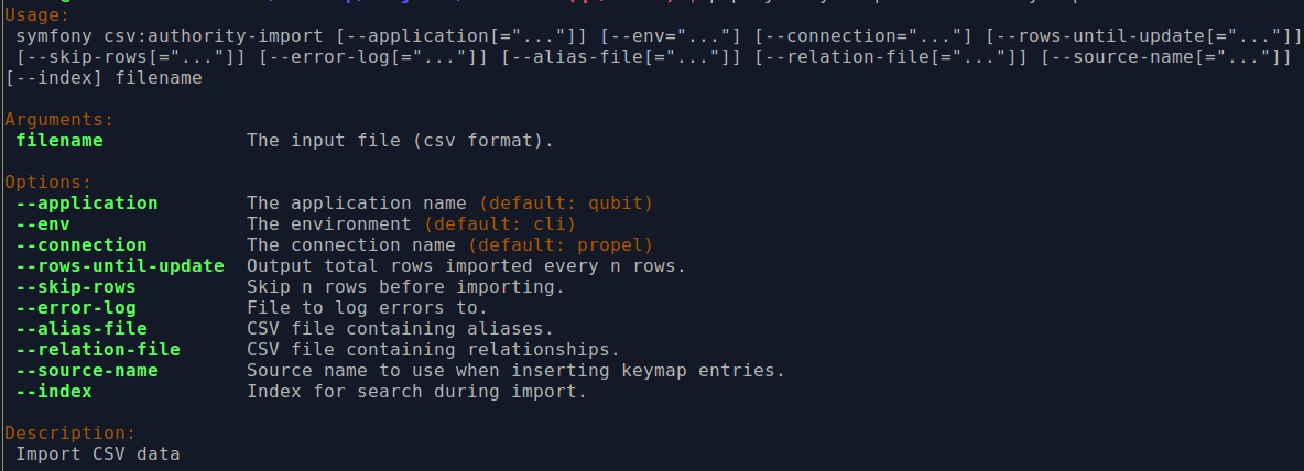 By typing php symfony help csv:authority-import into the command-line from your root directory, without specifying the location of a CSV, you will able able to see the CSV import options available (pictured above). A brief explanation of each is included below.