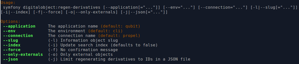 The --slug option can be used to target specific derivatives associated with a description, using the description’s slug as criteria. Any digital object attached or linked to the description whose slug is provided as criteria will have its derivatives regenerated. Example use: