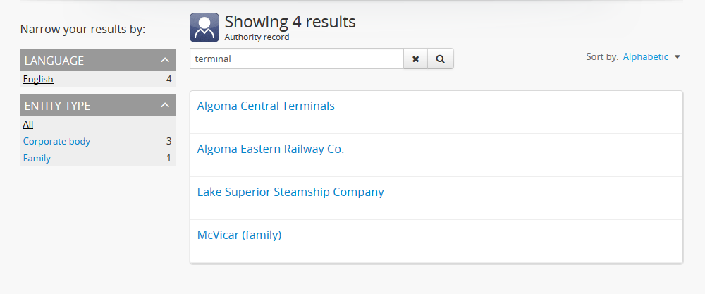 search term. - When you have found the record you are searching for, click on its title in the results, and AtoM will redirect you to the selected term’s view page.
