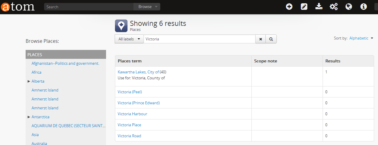 A place is a geographic location registered in a taxonomy and used as an access point in archival descriptions. For more information on managing places in AtoM, see: Terms. For information on adding access points to an archival description, see: Add an access point “on the fly” from an archival description.