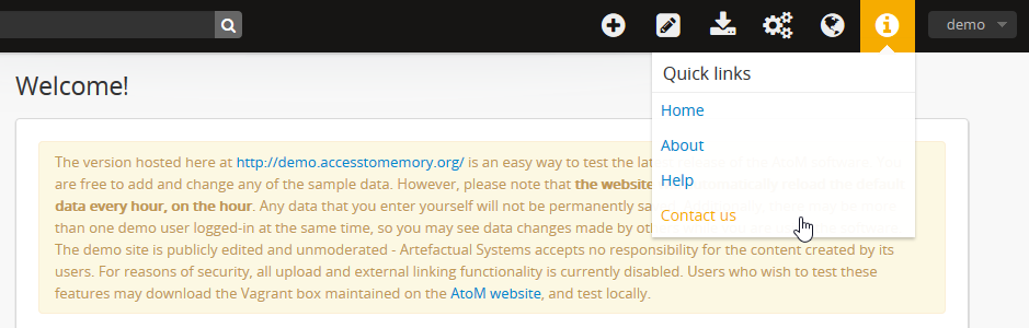 For more information on navigating in AtoM, see Navigation in AtoM.