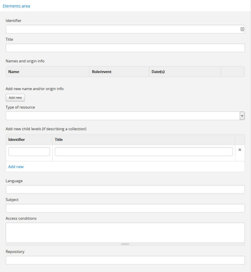 The data entry fields for the MODS archival description edit template.