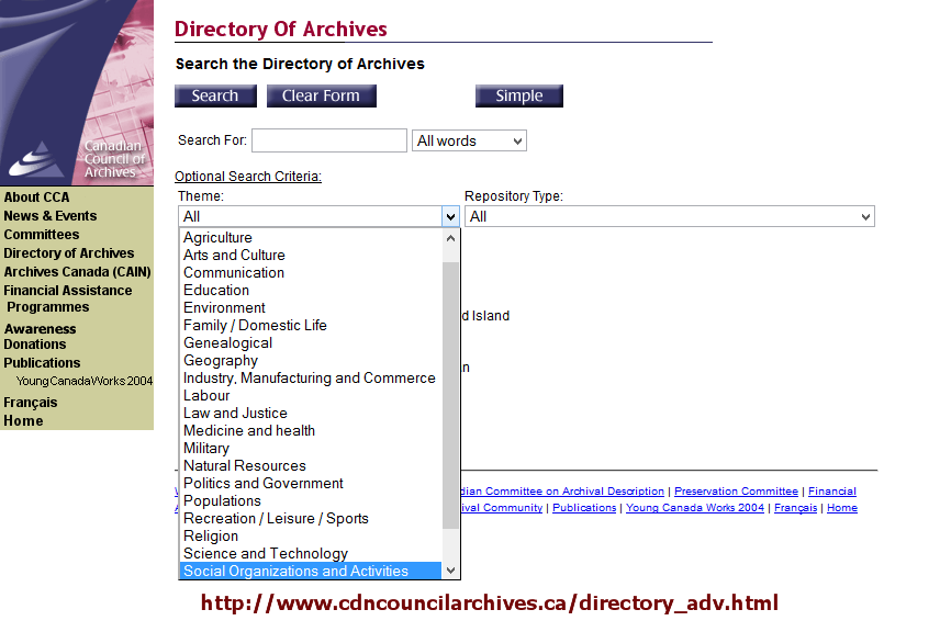 An image of the CCA’s Directory of Archives, showing the Theme terms that were used to create the default terms in AtoM’s Thematic area taxonomy.