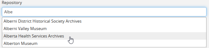 An archival institution can be added via a value list that appears in a drop-down menu - as you type data into the “Repository” field, the value list will narrow its options to present related suggestions. If the archival institution already exists, you can select the name from the values and a link will be created.